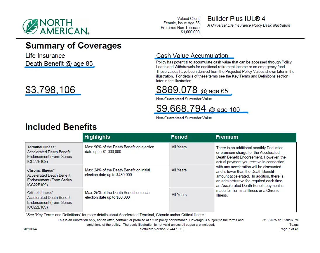 As you can see in the summary of coverages on the right, Jane’s policy is projected to accumulate enough cash for her to accomplish her goals and more. See the underlined numbers in the chart. That’s the power of IUL insurance. It works for Jane; it’ll work for you as well if you set up an IUL account today.